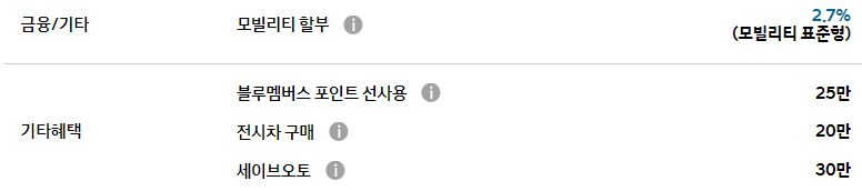 현대자동차 전용카드로 결제 시 50만원의 추가 할인을 받을 수 있으며, 모빌리티 할부로 2.7%의 낮은 금리로 자량 할부 구매가 가능합니다.