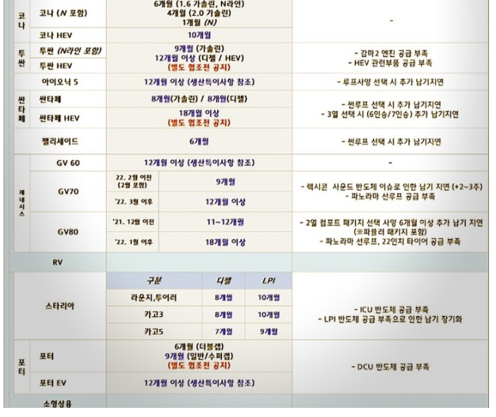 최근 차량 반도체 부족 현상으로 인하여 자동차 출고가 지연되고 있습니다. 하이브리드 자동차들은 출고 적체가 심하여 출고까지 1년 이상 걸리는 차종이 대부분입니다.