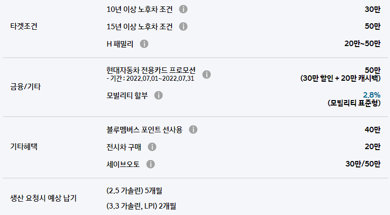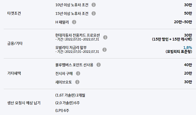 7월 현대자동차 판매조건, 구매 혜택, 납기 일정(2022)