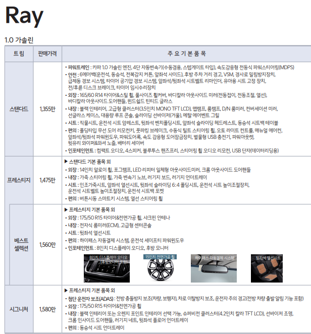 기아 레이는 1.0 가솔린 엔진을 사용합니다. 레이는 스탠더드, 프레스티지, 시그니처로 크게 3가지 트림으로 나누어 판매 중입니다.