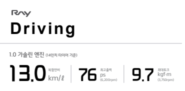 기아 레이는 1000cc 가솔린 엔진이 적용되어 있습니다. 13km/l의 연비로 동급 차량에 비해서는 낮은 수준의 연비를 보여줍니다.