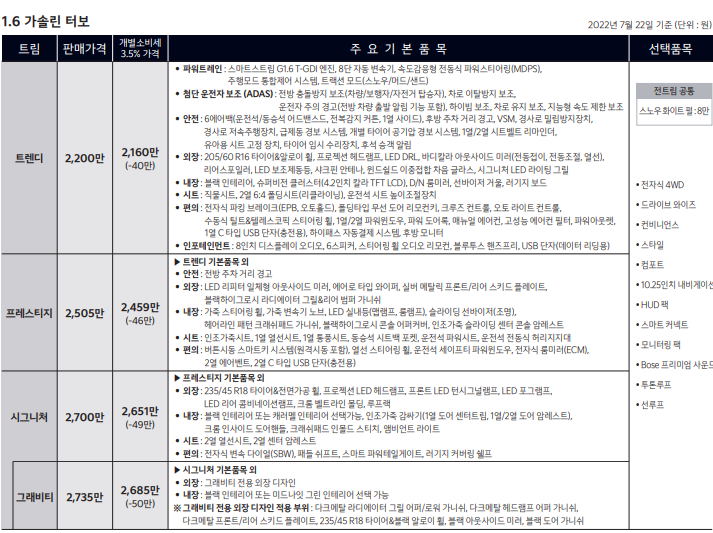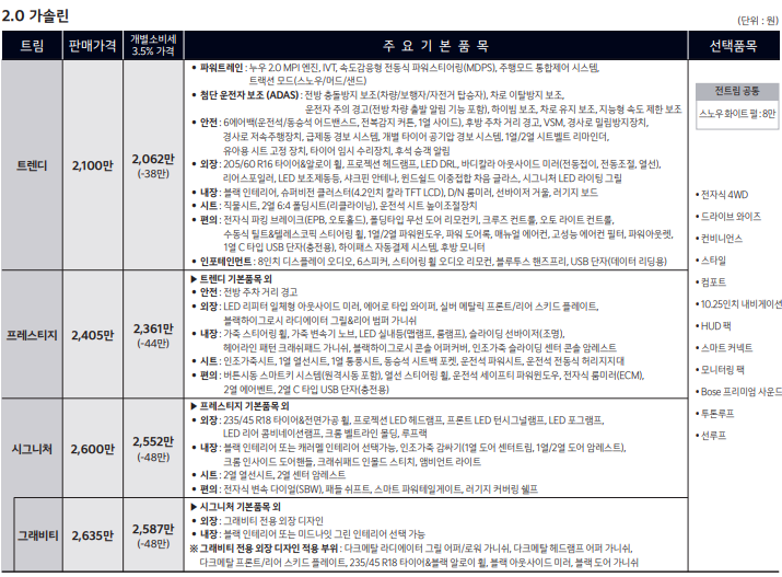 셀 토스는 트렌디, 프레스티지, 시그니처, 그래비티로 총 4가지 트림으로 나누어 판매 중입니다.