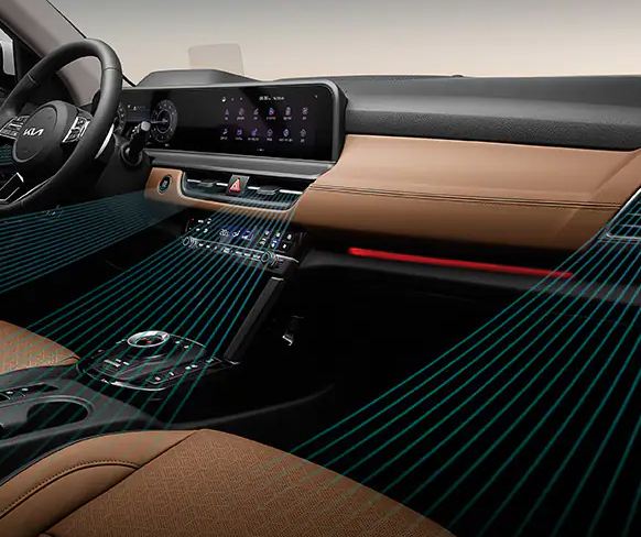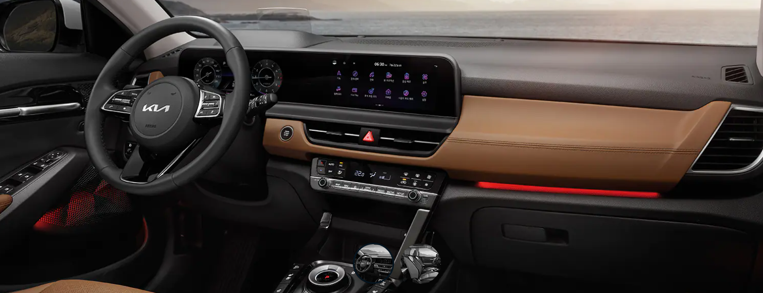 공기청정 모드와 통합형 컨트롤러가 적용되어 있어 쾌적한 실내환경을 탑승객에게 전달합니다. 실내 무드등이 적용되어 있으며 사운드 시스템과 연동으로 젊은 층들에게 어필하고 있는 셀토스 실내 디자인입니다.