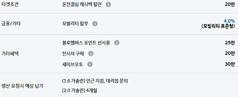 전기차 보조금을 받을 수 있는 차량이기에 현대자동차 자체 프로모션 혜택은 크지 않습니다.