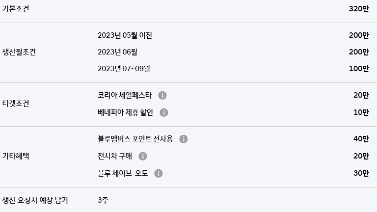 생산 월 조건에 따라서 최대 200만원의 할인도 추가로 받을 수 있습니다.