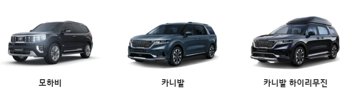 | 모하비 | ㆍ혜택 ①,② 中 택1 ① 공통혜택 50만 ② 스마트할부 1.0%(36개월) + ADT 캡스홈 도어가드 (36개월 서비스) + 20만 할인 ㆍ얼리버드 특별혜택 (~11일/~18일/~28일) : 30만 / 20만 / 10만 ㆍ생산월별 최대 3% |