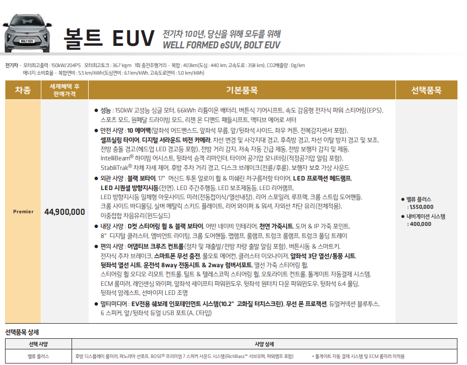 볼트 euv는 premier라는 단일 트림으로 판매 중이며 44,900,000원의 가격이 책정되었습니다.
