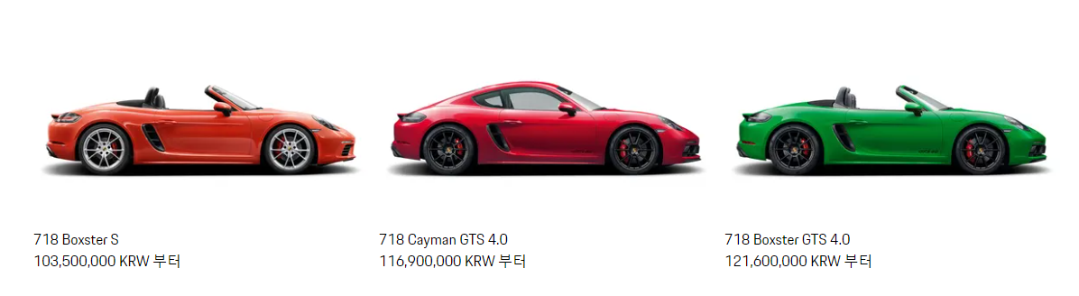 오픈카인 718 박스터는 9,160만 원부터 시작하며 718 고성능 모델들은 1억 초 중반대의 가격이 책정되었습니다.