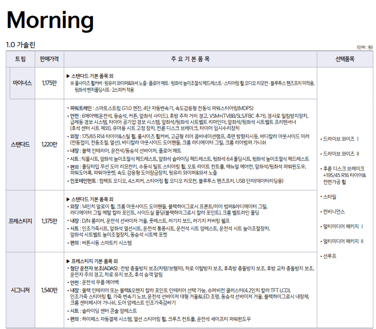 모닝 트림별 가격과 특징에 대하여 살펴보도록 하겠습니다.