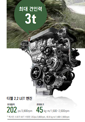 2.2 디젤 엔진이 적용되어 최대 출력 202마력과 최대 토크는 45입니다.