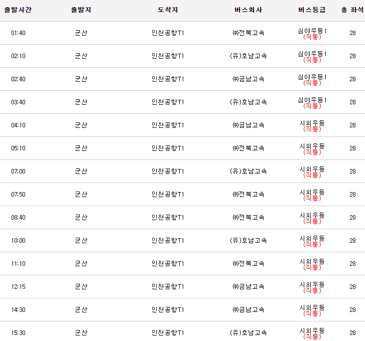 군산 공항리무진 첫차 1시 40분, 막차 15시 30분