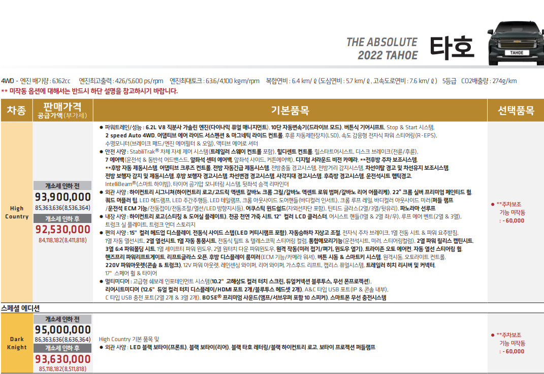 쉐보레 타호는 high country, dark knight로 두 가지 트림으로 나누어 판매 중입니다.