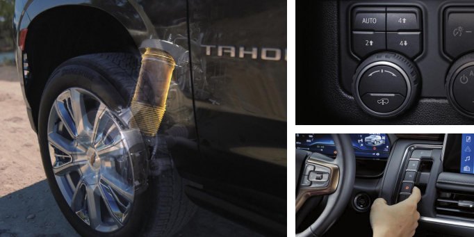 쉐보레 타호 버튼식 기어 변속기는 4륜 구동 시스템을 기본으로 장착하였으며, 에어 서스펜션을 통하여 자동으로 차량 높낮이를 조절 가능합니다.