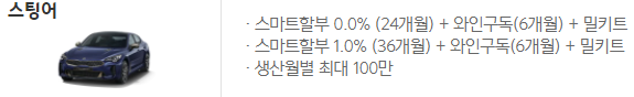 스팅어는 24개월 할부 시 0% 금리 혜택을 제공하고, 와인, 밀 키트를 제공하고 있습니다.