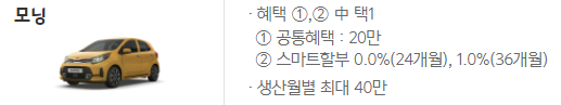 모닝의 경우 기본 20만 원 할인 혜택을 제공하고 있습니다.
