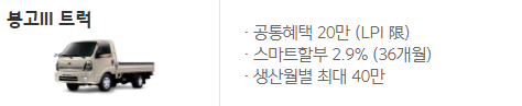봉고 3 트럭, 기아 1톤 트럭의 경우 20만 원의 할인 혜택을 공통적으로 제공합니다