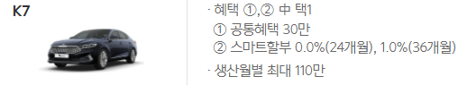 k7의 재고차 경우 최대 110만 원의 할인을 제공합니다.