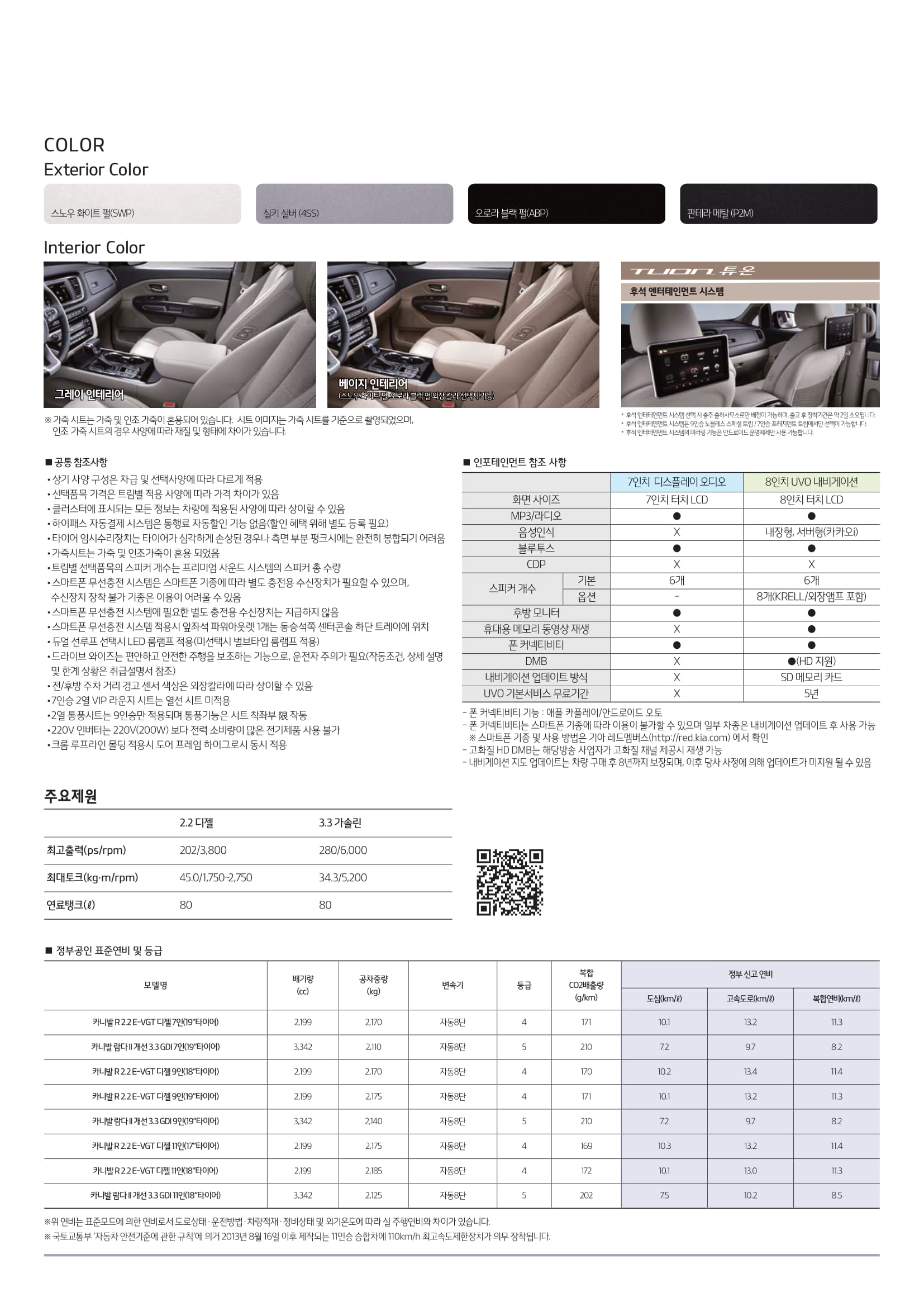 •파워트레인 : R 2.2 E-VGT 디젤 엔진, 8단 자동변속기(수동겸용, 부츠타입), 액티브 에코 시스템 •안전 : 6에어백(운전석/동승석 스마트 에어백, 전복감지 커튼, 1열 사이드), 후방 주차 거리 경고, 경사로 밀림 방지 장치, 급제동경보시스템, 개별 타이어 공기압 경보 시스템, 유아용 시트 고정 장치(2열), 타이어 임시수리 장치, 소화기 •외장 : 235/65 R17 타이어&알로이 휠, 프로젝션 헤드램프, 프로젝션 포그램프, LED 보조제동등, LED 리피터 일체형 아웃사이드 미러(전동접이, 전동조절, 열선), 크롬 아웃사이드 도어 핸들, 도어손잡이 조명(프론트), 머드가드, 리어 스포일러, 샤크핀 안테나 •내장 : 그레이 인테리어, 고급형 클러스터(3.5인치 MONO TFT LCD), 전자식 룸미러(ECM), 컨버세이션 미러, 선바이저(거울, 조명), 글로브박스 조명 •시트 : 인조가죽시트, 1열 열선시트, 1열 시트벨트 높이조절장치, 2열 시트(슬라이딩, 리클라이닝, 암레스트, 센터 점프 시트), 3열 시트(슬라이딩, 리클라이닝, 센터 점프 시트), 4열 팝업 싱킹 시트 •편의 : 버튼시동 스마트키 시스템, 풋파킹 브레이크, 수동식 틸트&텔레스코픽 스티어링 휠, 크루즈 컨트롤,매뉴얼 에어컨,파워 아웃렛, 1열/2열 파워윈도우, 후방 모니터, 오토 라이트 컨트롤, 파워 도어록, 파워스티어링, 별물형 USB 충전기, PTC 보조 히터 •인포테인먼트 : 7인치 디스플레이 오디오, 6스피커, 스티어링 휠 오디오 리모컨, 블루투스 핸즈프리, AUX&USB 단자