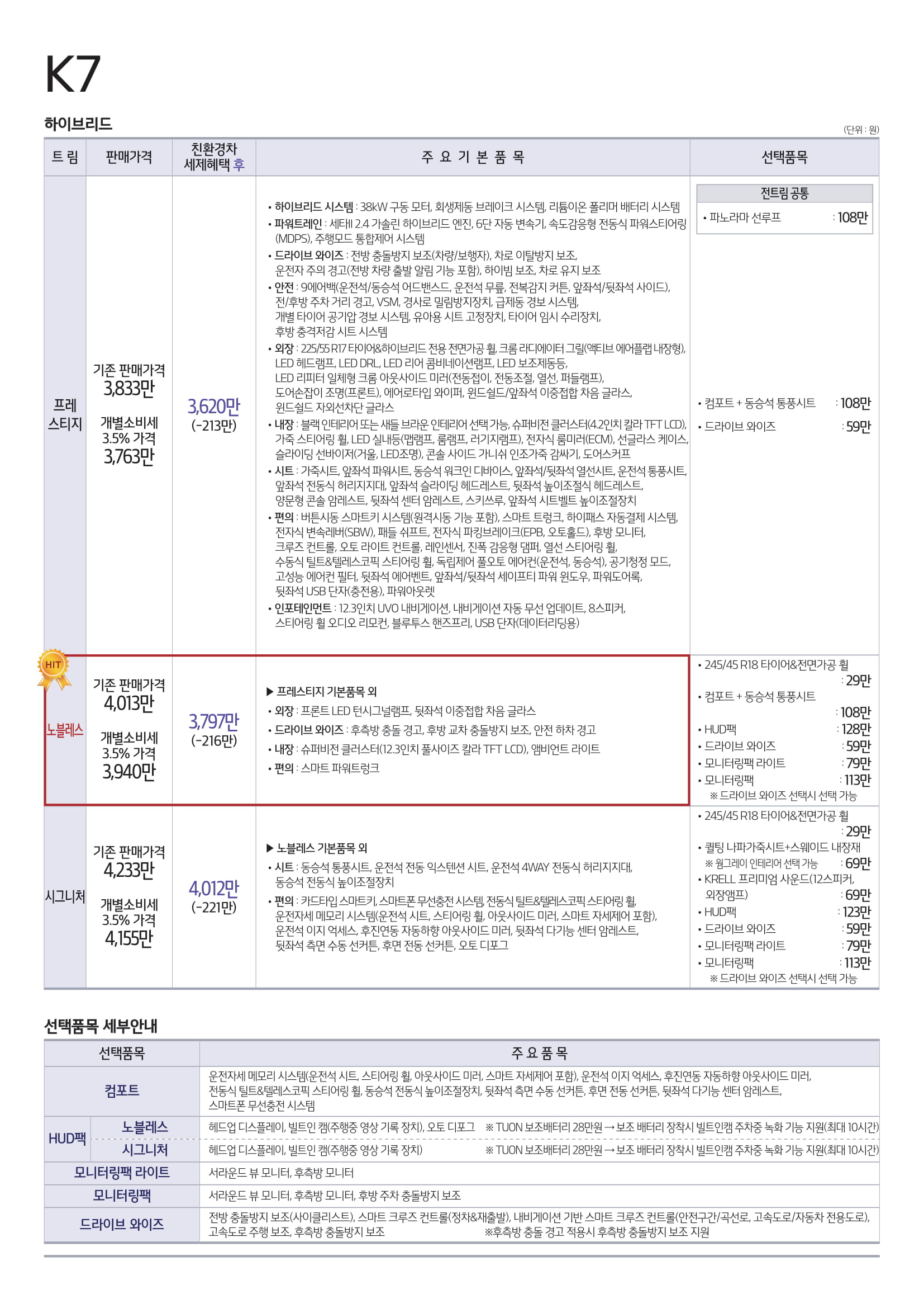 자 이처럼 총 3가지의 트림으로 구성된 k7 하이브리드 가격 및 옵션