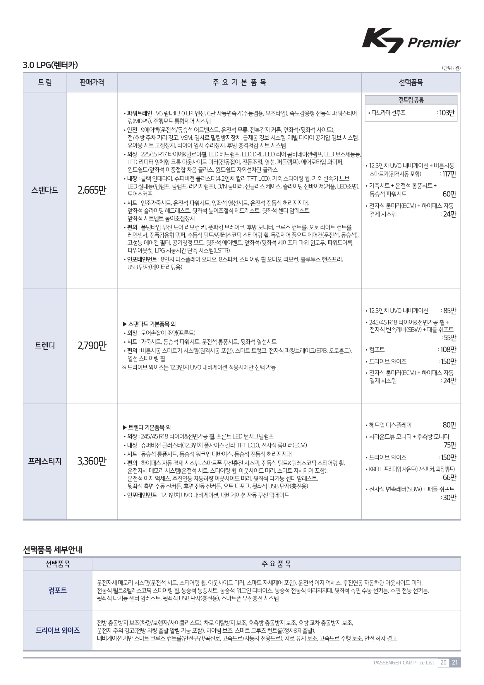 자 지난 k7(가솔린) 가격, 가격표에 이어