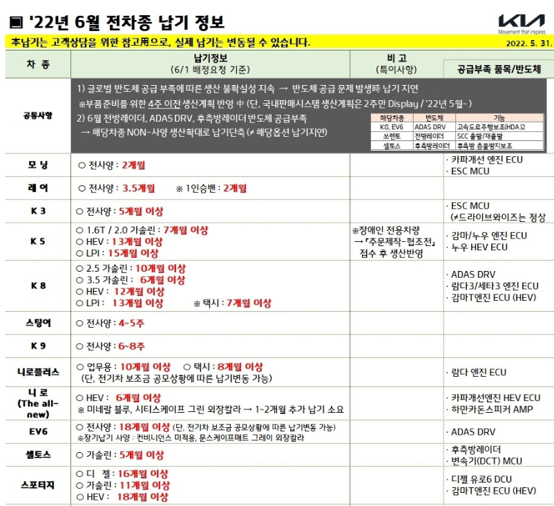 22년 6월 기아차 납기 정보, 출고 대기기간