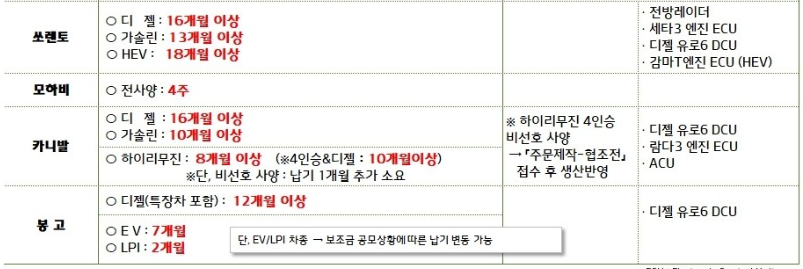 봉고 트럭 디젤 차량은 1년 이상 출고 대기기간이 소요되며, lpi 모델은 2개월의 출고 대기기간으로 짧은 편입니다.
