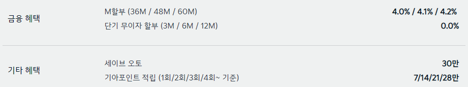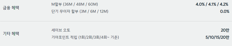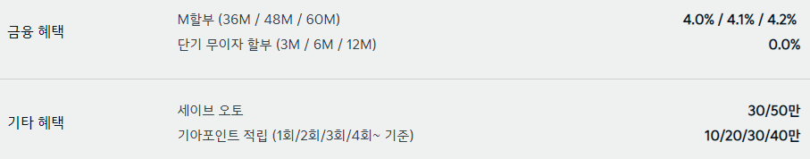 m할부, 단기부이자 할부 혜택, 세이브 오토 할인, 기아 포인트 적립 혜택 등이 기본적으로 제공됩니다.