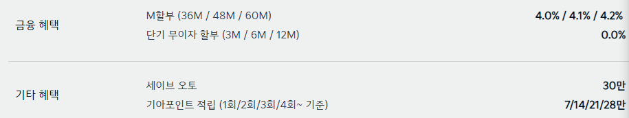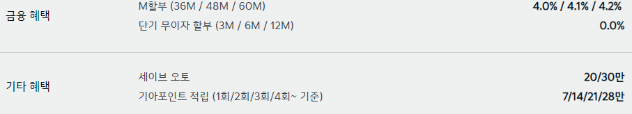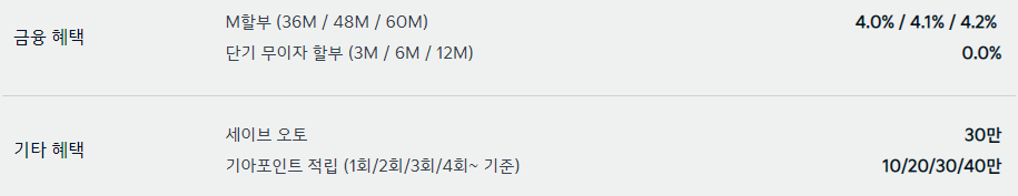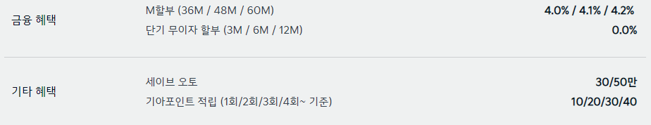 m 할부, 단기 무이자 할부, 세이브 오토 할인, 기아 포인트 적립 등의 혜택이 제공됩니다.