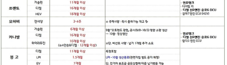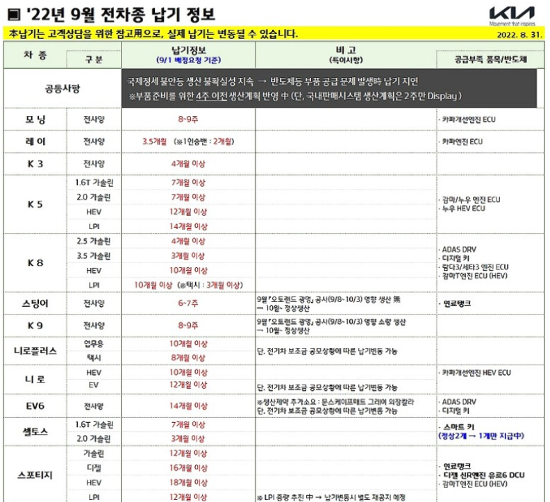 기아자동차 9월 납기 일정은 8월과 비슷합니다.