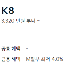 기아 k8 차량은 m 할부를 통하여 최저 4%의 금리로 할부 구매가 가능합니다.