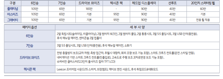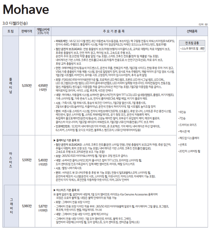 모하비는 트림에 따라서 플래티넘, 마스터지, 그래비티의 3가지 트림으로 나누어 판매 중입니다.