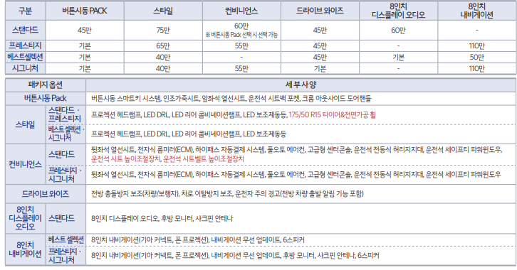 기본 트림의 스탠다드는 편의사양이 부족한 편입니다. 하지만 영업용이나 차량 이용이 크지 않은 소비자들은 충분히 구매를 고려할만한 트림입니다.