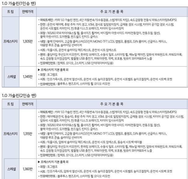 기아 레이는 1.0 가솔린 엔진을 사용합니다. 레이는 스탠더드, 프레스티지, 시그니처로 크게 3가지 트림으로 나누어 판매 중입니다.