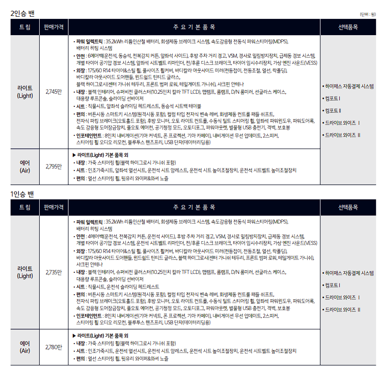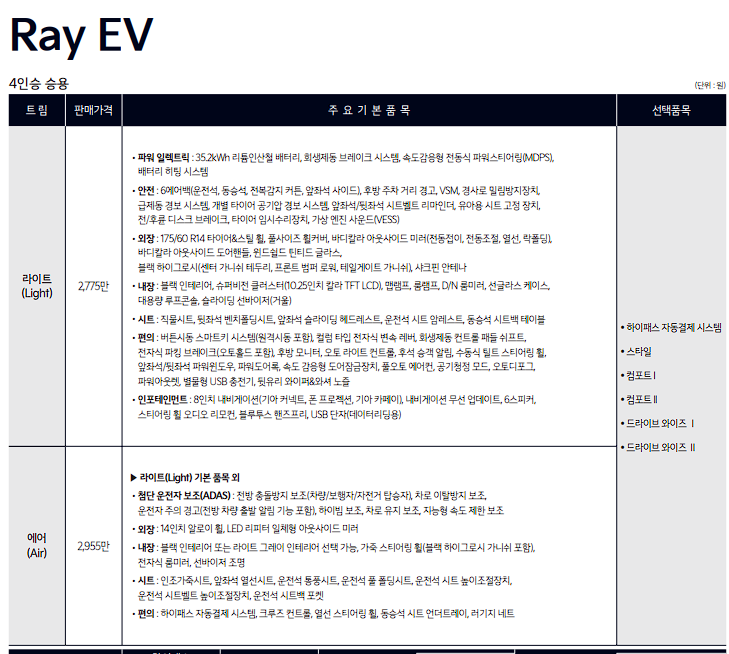 레이 EV 라이트 트림 가격은 27,750,000원입니다. 레이 EV 에어 가격은 29,550,000원입니다.