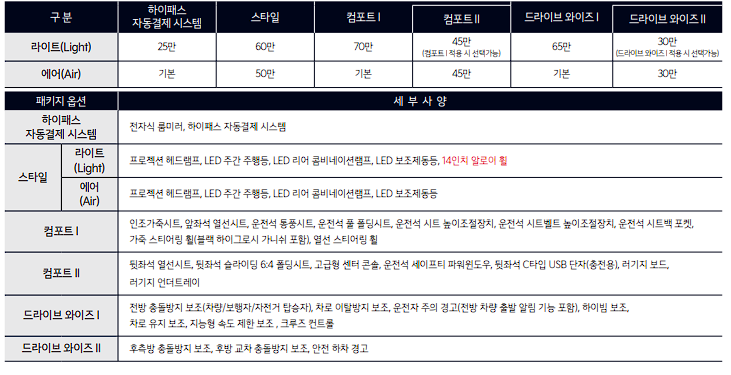 레이 EV 에어는 라이트 모델에 비하여 200만원 가량 비쌉니다. 전방 충돌방지 보조 기능과 차선 이탈방지 보조 기능이 장착됩니다. 또한, 14인치 휠과 인조 가죽 시트와 1열 열선 및 통풍 시트도 추가로 장착됩니다.