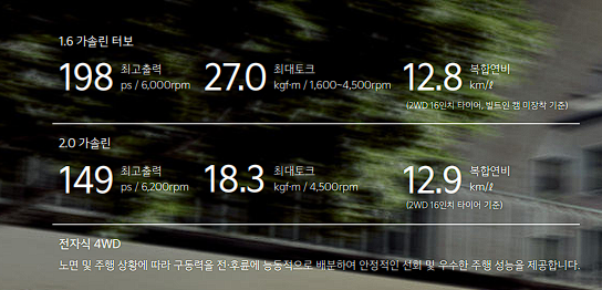 1.6 가솔린 터보 엔진은 2.0 가솔린에 비하여 가격이 약 100만 원가량 높게 책정되었습니다.