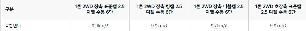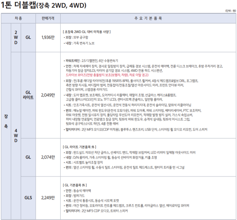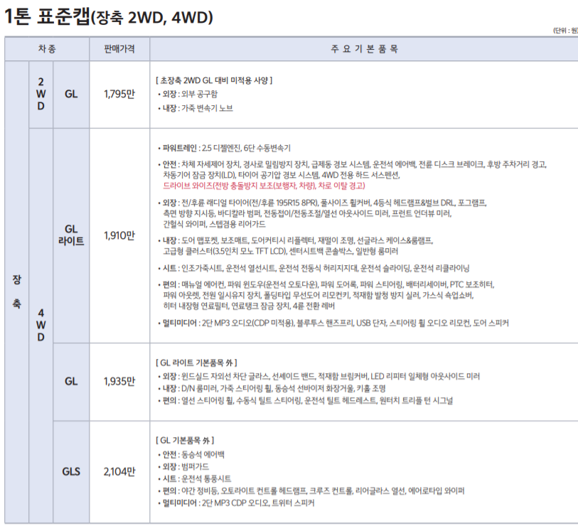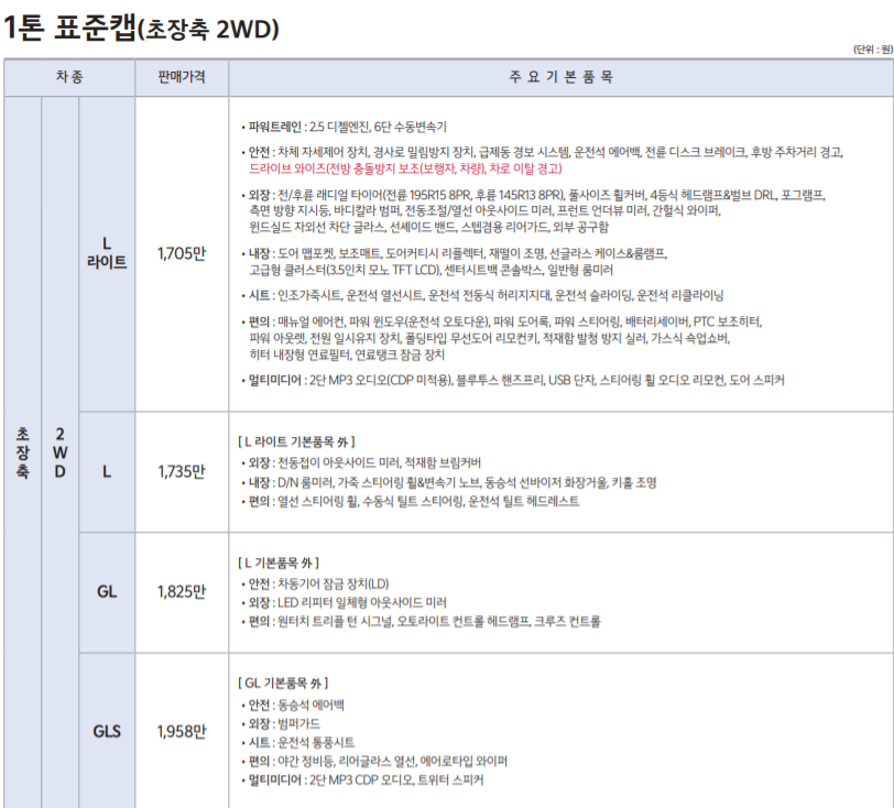 | •파워트레인 : 2.5 디젤엔진, 6단 수동변속기 •안전 : 차체 자세제어 장치, 경사로 밀림방지 장치, 급제동 경보 시스템, 운전석 에어백, 전륜 디스크 브레이크, 후방 주차거리 경고, 드라이브 와이즈(전방 충돌방지 보조(보행자, 차량), 차로 이탈 경고) •외장 : 전/후륜 래디얼 타이어(전륜 195R15 8PR, 후륜 145R13 8PR), 풀사이즈 휠커버, 4등식 헤드램프&벌브 DRL, 포그램프, 측면 방향 지시등, 바디칼라 범퍼, 전동조절/열선 아웃사이드 미러, 프런트 언더뷰 미러, 간헐식 와이퍼, 윈드실드 자외선 차단 글라스, 선셰이드 밴드, 스텝겸용 리어가드, 외부 공구함 •내장 : 도어 맵포켓, 보조매트, 도어커티시 리플렉터, 재떨이 조명, 선글라스 케이스&룸램프, 고급형 클러스터(3.5인치 모노 TFT LCD), 센터시트백 콘솔박스, 일반형 룸미러 •시트 : 인조가죽시트, 운전석 열선시트, 운전석 전동식 허리지지대, 운전석 슬라이딩, 앞좌석 리클라이닝 •편의 : 매뉴얼 에어컨, 파워 윈도우(운전석 오토다운), 파워 도어록, 파워 스티어링, 배터리세이버, PTC 보조히터, 파워 아웃렛, 전원 일시유지 장치, 폴딩타입 무선도어 리모컨키, 적재함 발청 방지 실러, 가스식 쇽업쇼버, 히터 내장형 연료필터, 연료탱크 잠금 장치 •멀티미디어 : 2단 MP3 오디오(CDP 미적용), 블루투스 핸즈프리, USB 단자, 스티어링 휠 오디오 리모컨, 도어 스피커 |