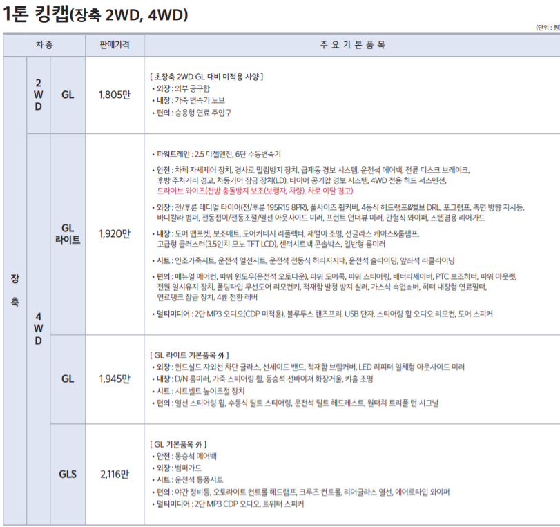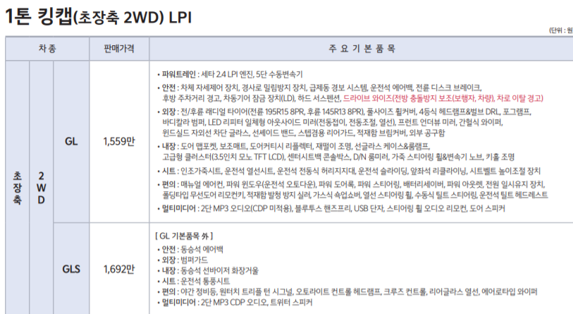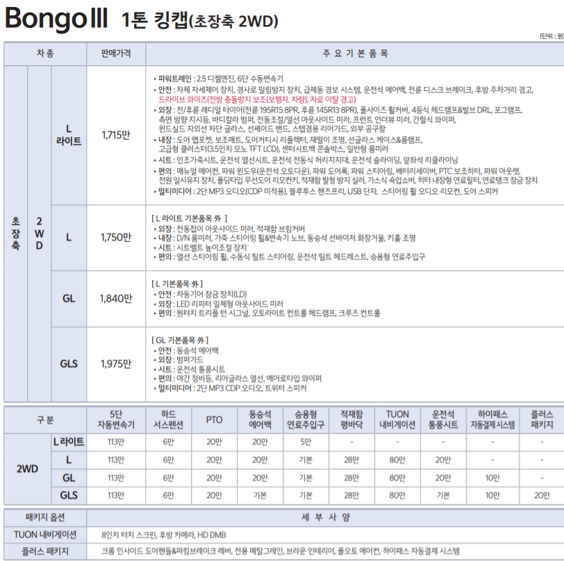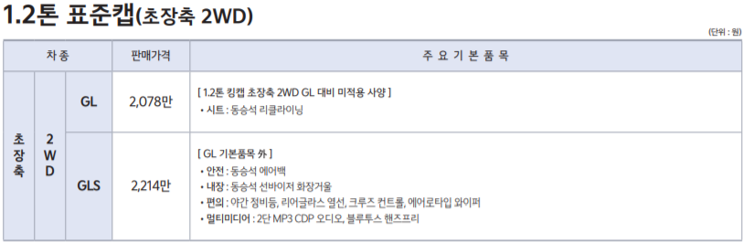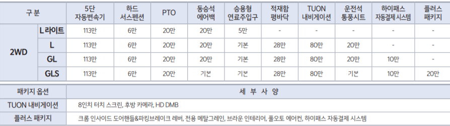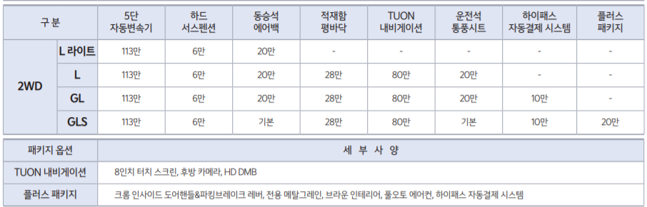 | [ GL 기본품목 ] •안전 : 동승석 에어백 •외장 : 범퍼가드 •시트 : 운전석 통풍시트 •편의 : 야간 정비등, 리어글라스 열선, 에어로타입 와이퍼 •멀티미디어 : 2단 MP3 CDP 오디오, 트위터 스피커 |