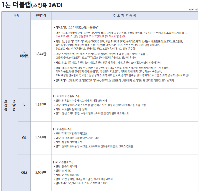 | [ L 라이트 기본품목 ] •외장 : 전동접이 아웃사이드 미러, 적재함 브림커버 •내장 : D/N 룸미러, 가죽 스티어링 휠&변속기 노브, 동승석 선바이저 화장거울, 키홀 조명 •시트 : 시트벨트 높이조절 장치 •편의 : 열선 스티어링 휠, 수동식 틸트 스티어링, 운전석 틸트 헤드레스트 |