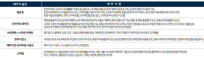 ■편의 : 버튼시동 스마트키 시스템(원격 시동 포함), 스마트 트렁크, 하이패스 자동결제 시스템, 전자식 파킹 브레이크(EPB, 오토 홀드),