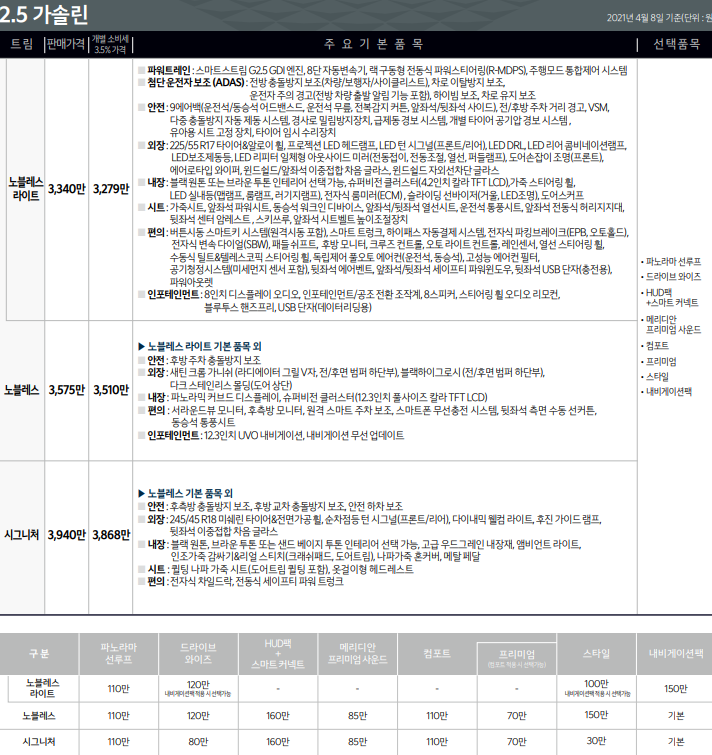 2.5 가솔린 옵션, 선택 옵션의 경우 위와 같인 품목과 가격으로 구성되어있습니다.