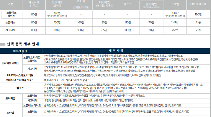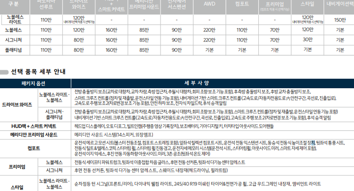 노블레스 라이트, 노블레스, 시그니처로 총 세 트림으로 이루어져 있습니다.