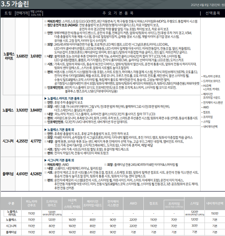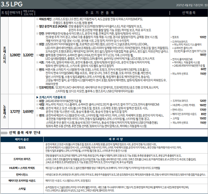 그럼 본격적으로 2.5,3,5 가솔린 엔진, 3.5 lpi 가스차 엔진에 대하여 트림별 옵션 가격을 알아보도록 하겠습니다.