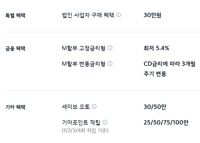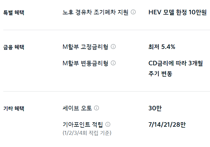 이외 M할부, 세이브 오토, 기아 포인트 적립 등의 혜택을 추가로 받을 수 있습니다.