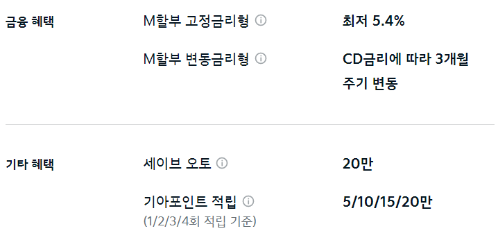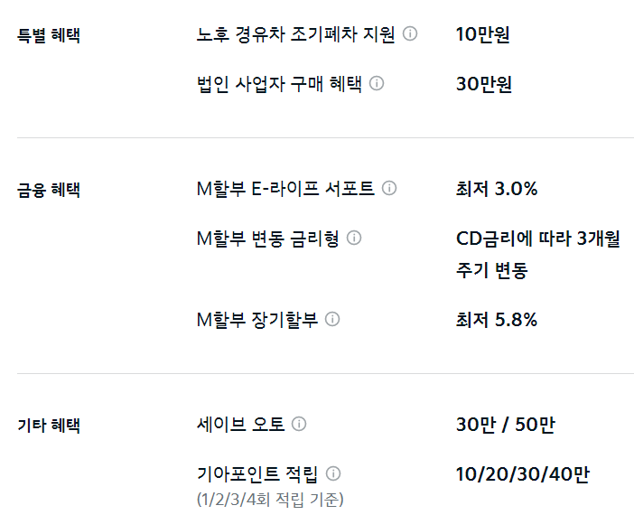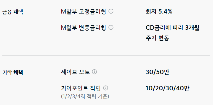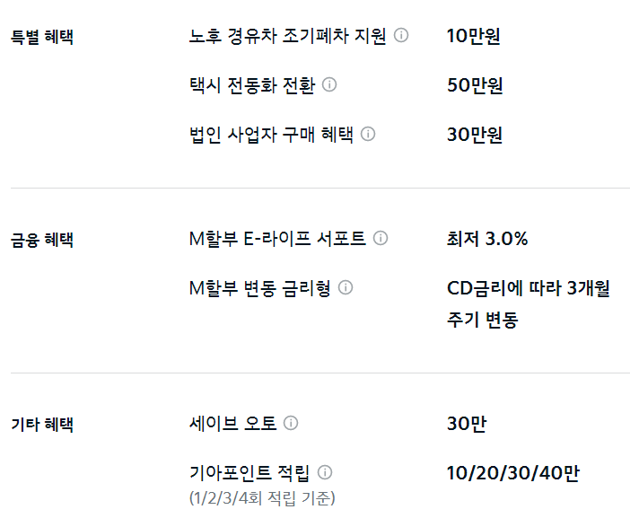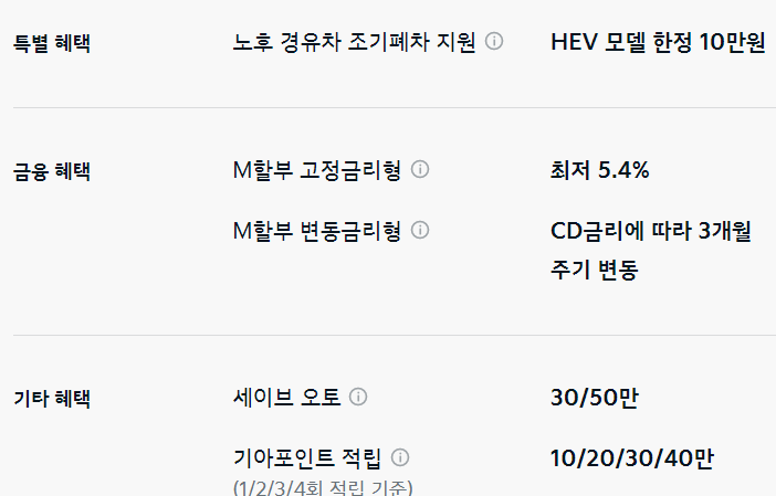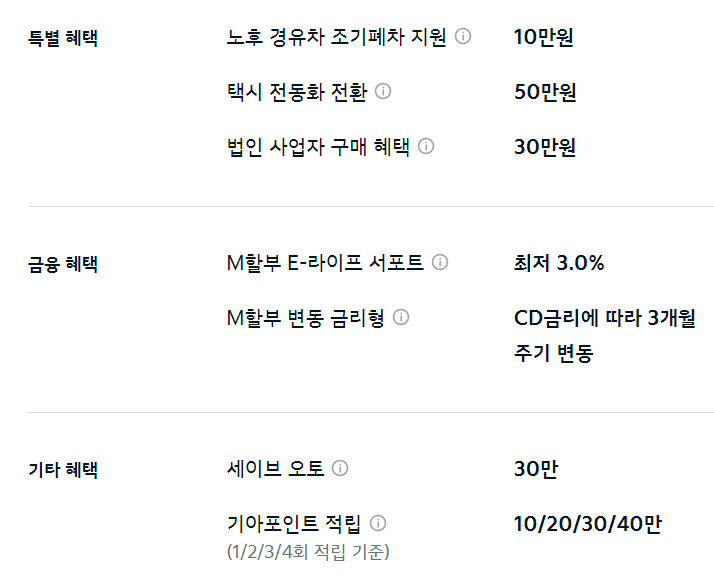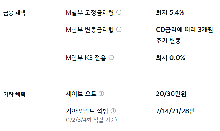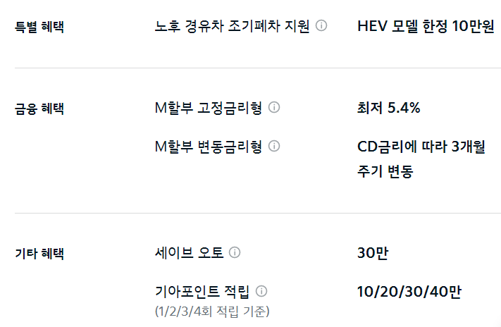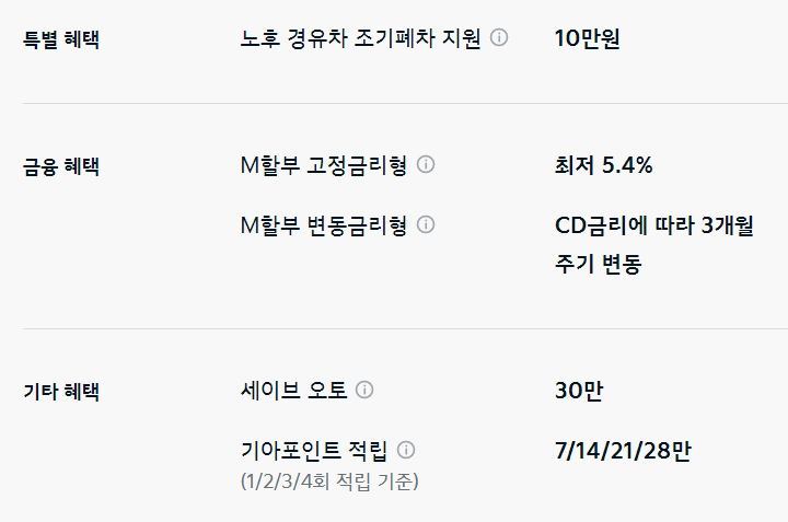 이외 M할부, 세이브 오토, 기아 포인트 적립 등의 혜택을 추가로 받을 수 있습니다.