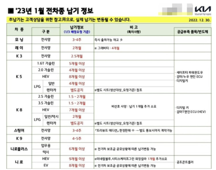 기아 1월 판매조건, 구매혜택, 납기 정보(2023)