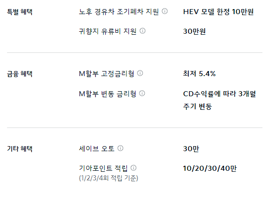 금융 혜택은 M할부 프로그램이 제공되며, 세이브 오토나 기아포인트 적립 혜택도 받을 수 있습니다.