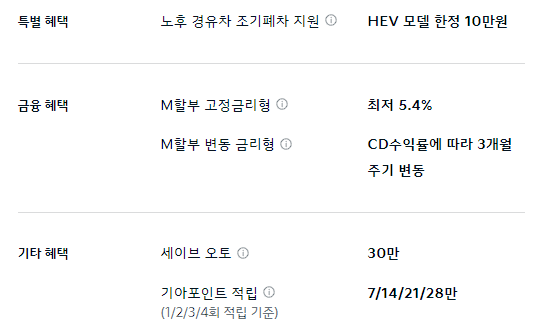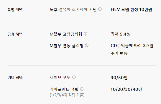 쏘렌토 하이브리드 구매 고객은 노후 경유차 조기 폐차 지원금으로 10만 원이 제공됩니다.