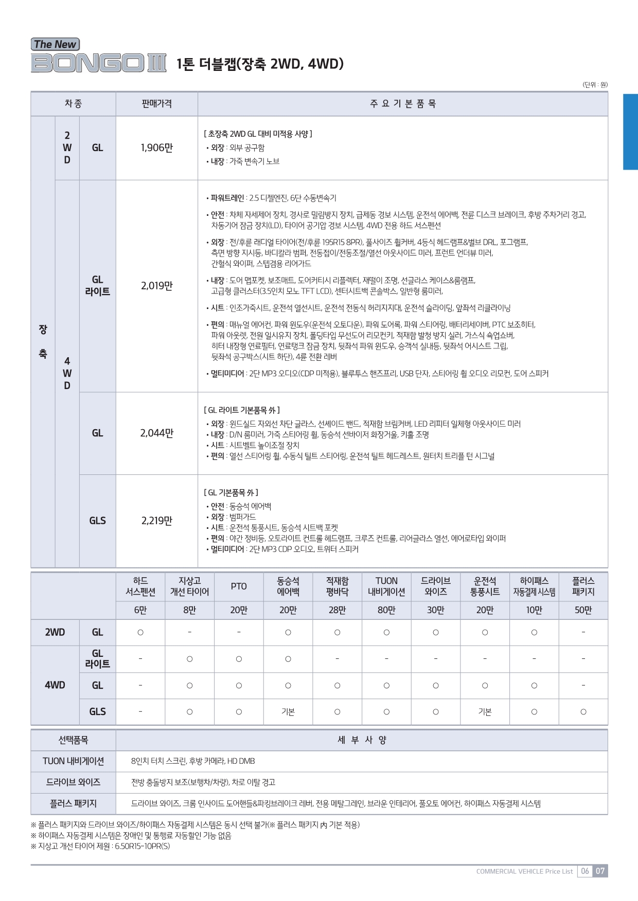 4WD | GL라이트 | 1,880만원 | •파워트레인 : 2.5 디젤엔진, 6단 수동변속기 •안전 : 차체 자세제어 장치, 경사로 밀림방지 장치, 급제동 경보 시스템, 운전석 에어백, 전륜 디스크 브레이크, 후방 주차거리 경고, 차동기어 잠금 장치(LD), 타이어 공기압 경보 시스템, 4WD 전용 하드 서스펜션 •외장 : 전/후륜 래디얼 타이어(전/후륜 195R15 8PR), 풀사이즈 휠커버, 4등식 헤드램프&벌브 DRL, 포그램프, 측면 방향 지시등, 바디칼라 범퍼, 전동접이/전동조절/열선 아웃사이드 미러, 프런트 언더뷰 미러, 간헐식 와이퍼, 스텝겸용 리어가드 •내장 : 도어 맵포켓, 보조매트, 도어커티시 리플렉터, 재떨이 조명, 선글라스 케이스&룸램프, 고급형 클러스터(3.5인치 모노 TFT LCD), 센터시트백 콘솔박스, 일반형 룸미러 •시트 : 인조가죽시트, 운전석 열선시트, 운전석 전동식 허리지지대, 운전석 슬라이딩, 운전석 리클라이닝 •편의 : 매뉴얼 에어컨, 파워 윈도우(운전석 오토다운), 파워 도어록, 파워 스티어링, 배터리세이버, PTC 보조히터, 파워 아웃렛, 전원 일시유지 장치, 폴딩타입 무선도어 리모컨키, 적재함 발청 방지 실러, 가스식 쇽업쇼버, 히터 내장형 연료필터, 연료탱크 잠금 장치, 4륜 전환 레버 •멀티미디어 : 2단 MP3 오디오(CDP 미적용), 블루투스 핸즈프리, USB 단자, 스티어링 휠 오디오 리모컨, 도어 스피커 |