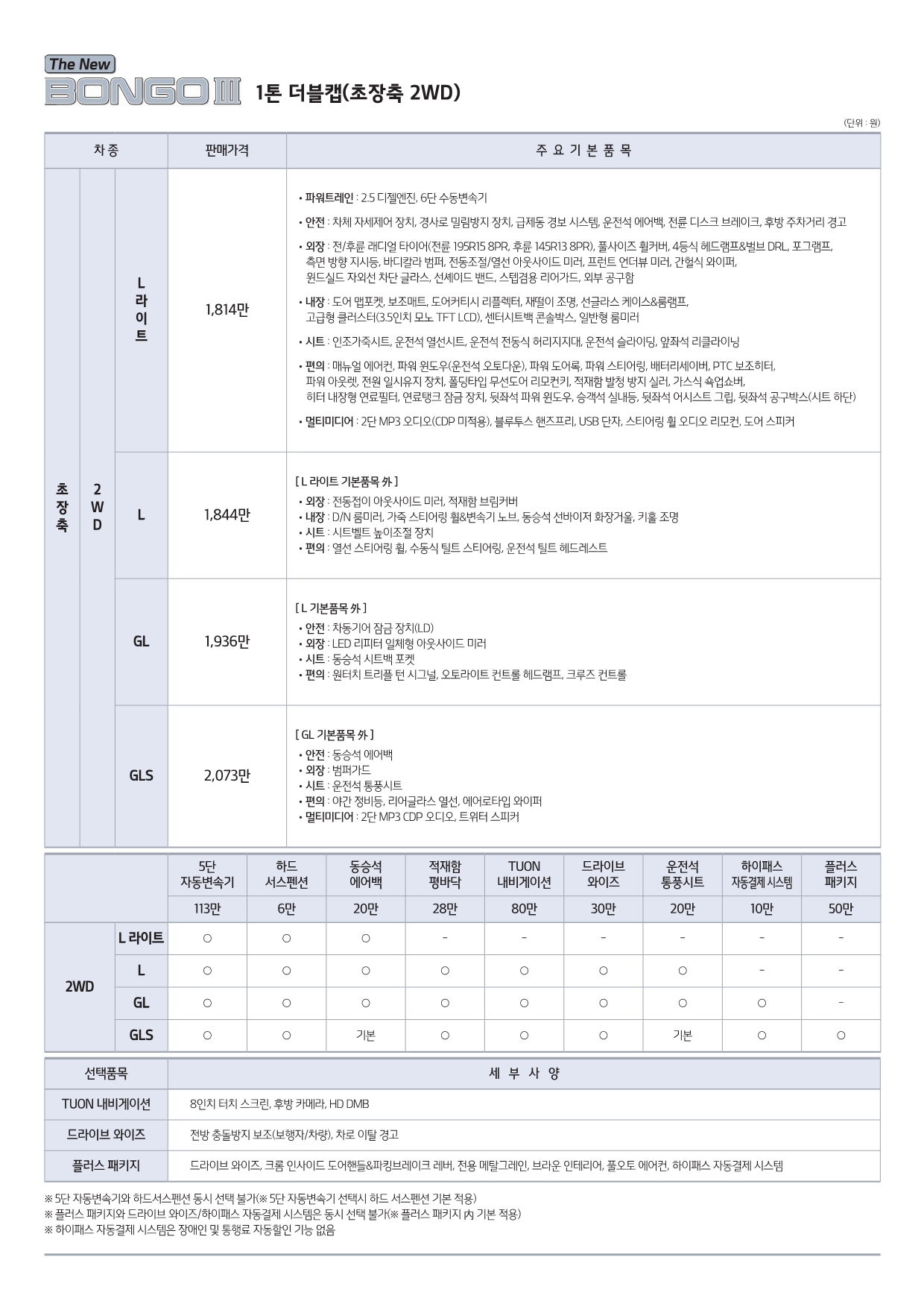 GLS | 2,219만원 | [ GL 기본품목 ] •안전 : 동승석 에어백 •외장 : 범퍼가드 •시트 : 운전석 통풍시트, 동승석 시트백 포켓 •편의 : 야간 정비등, 오토라이트 컨트롤 헤드램프, 크루즈 컨트롤, 리어글라스 열선, 에어로타입 와이퍼 •멀티미디어 : 2단 MP3 CDP 오디오, 트위터 스피커 |